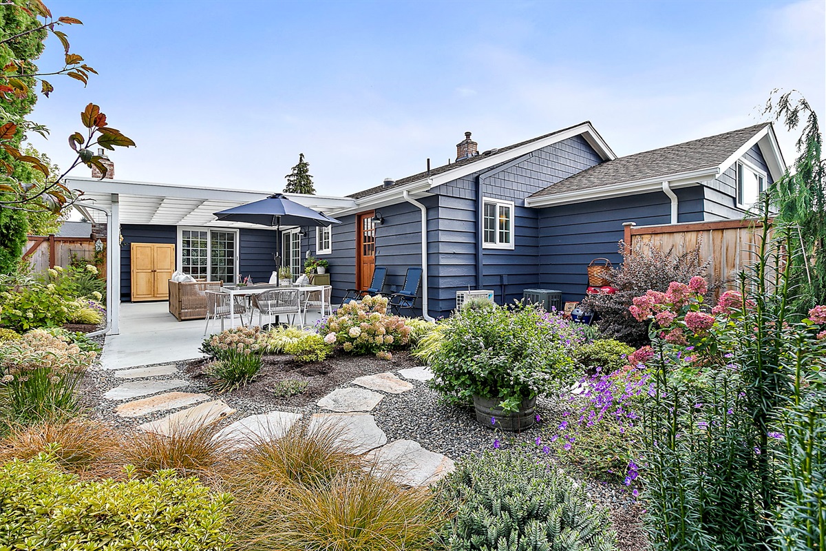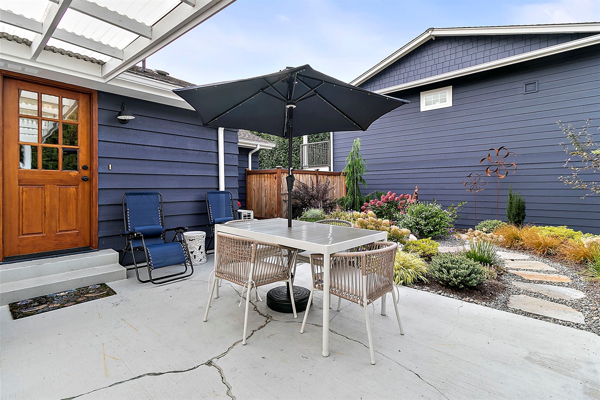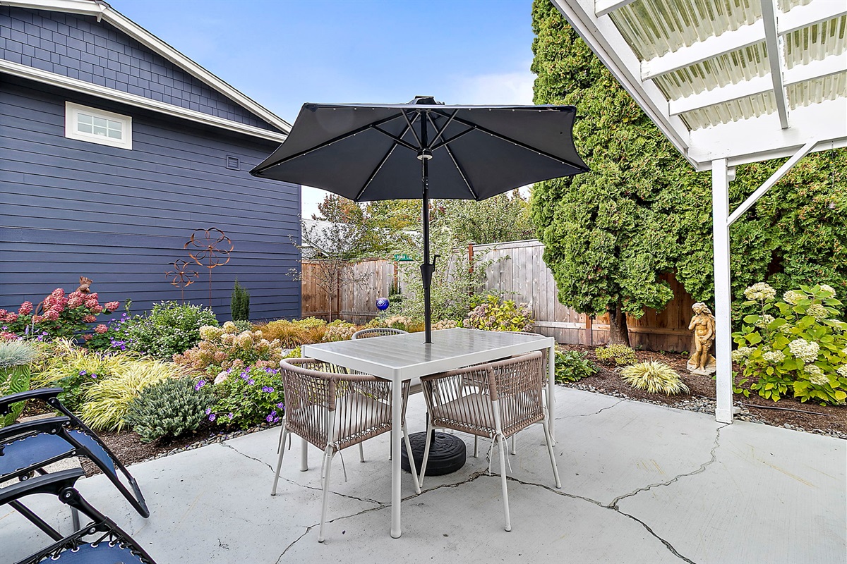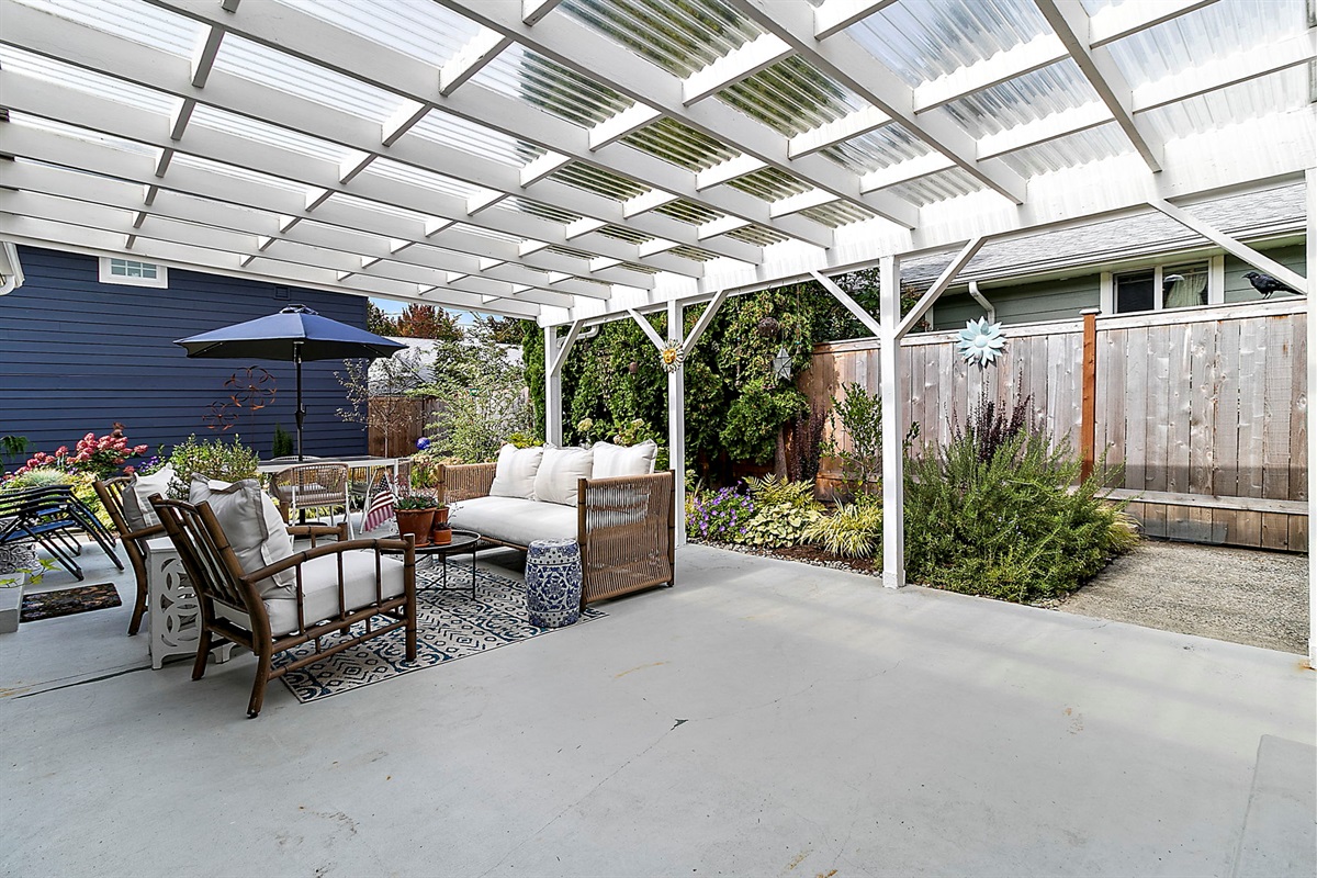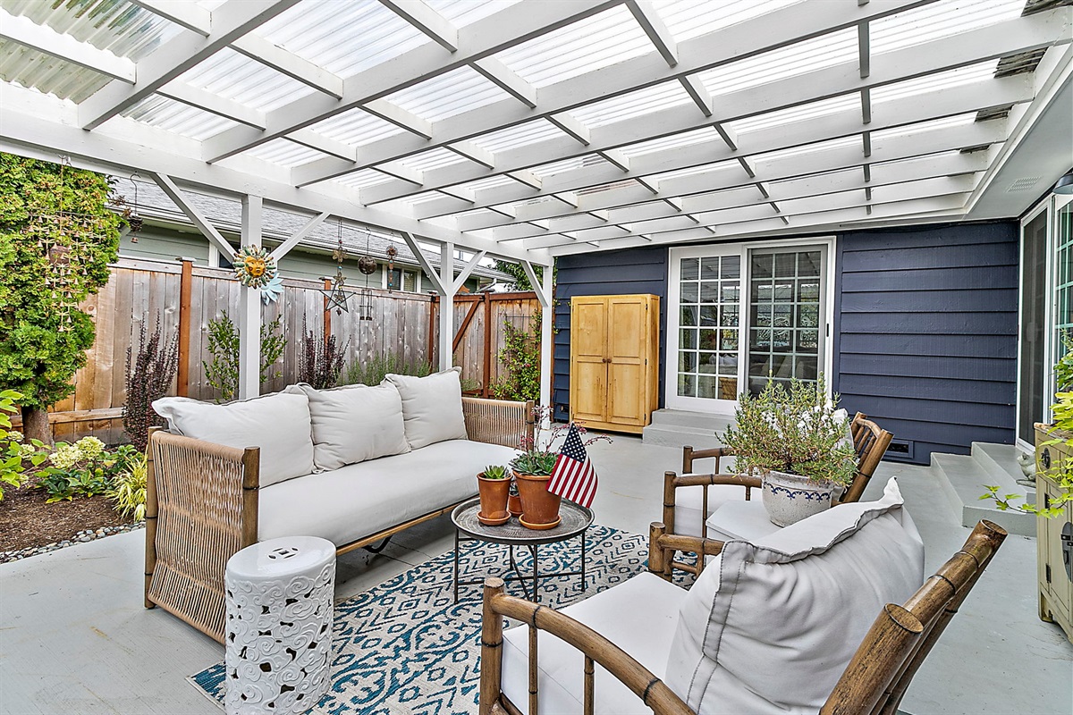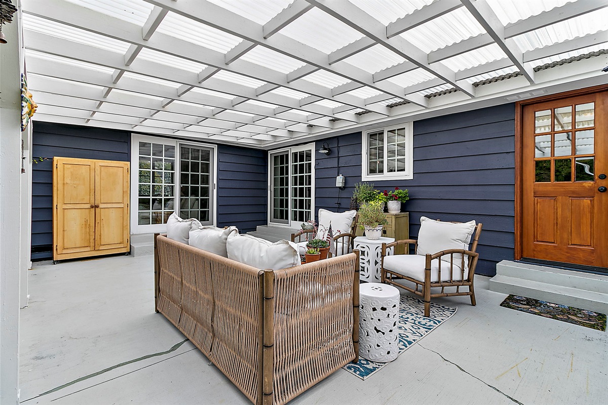 Outdoor Oasis: Step outside to a covered patio with a cozy lounge and outdoor dining setup, perfect for al fresco meals or relaxing evenings under the stars.