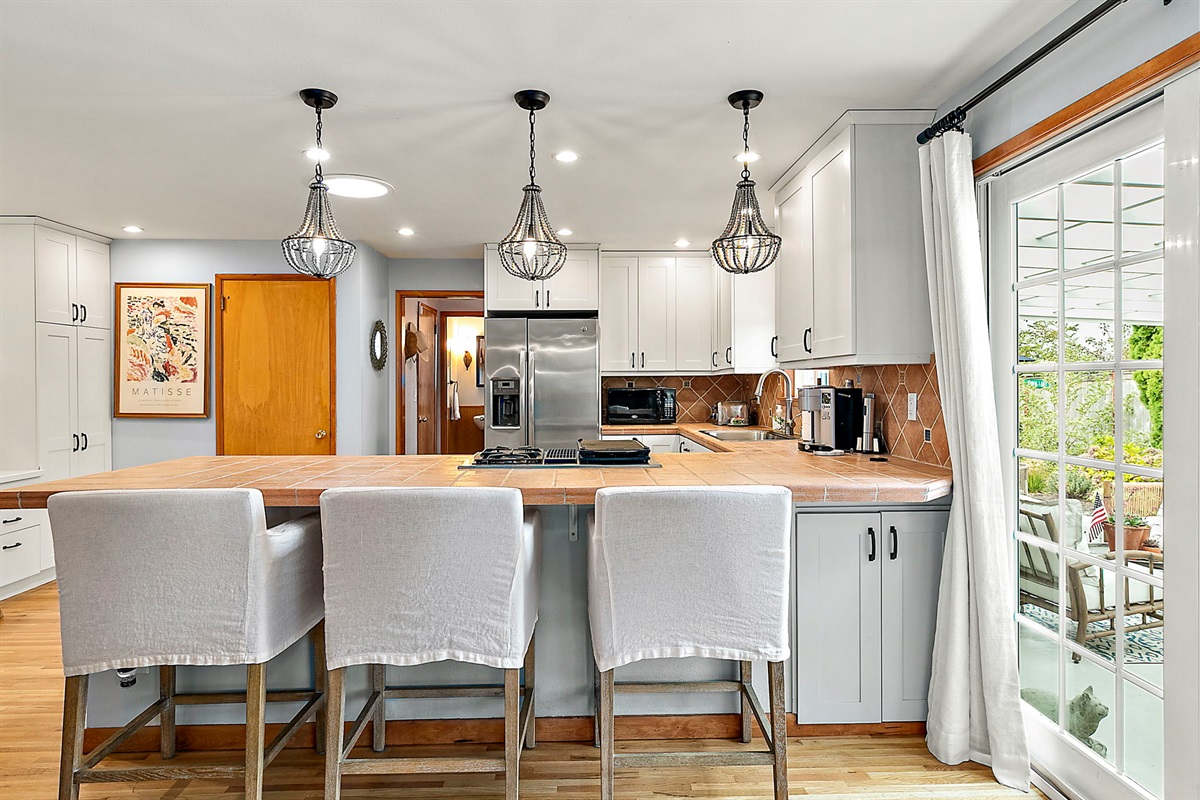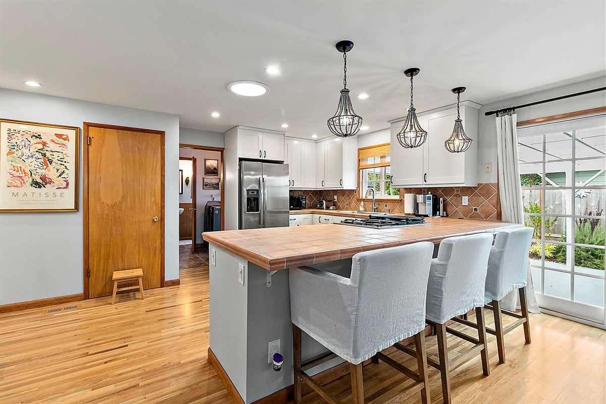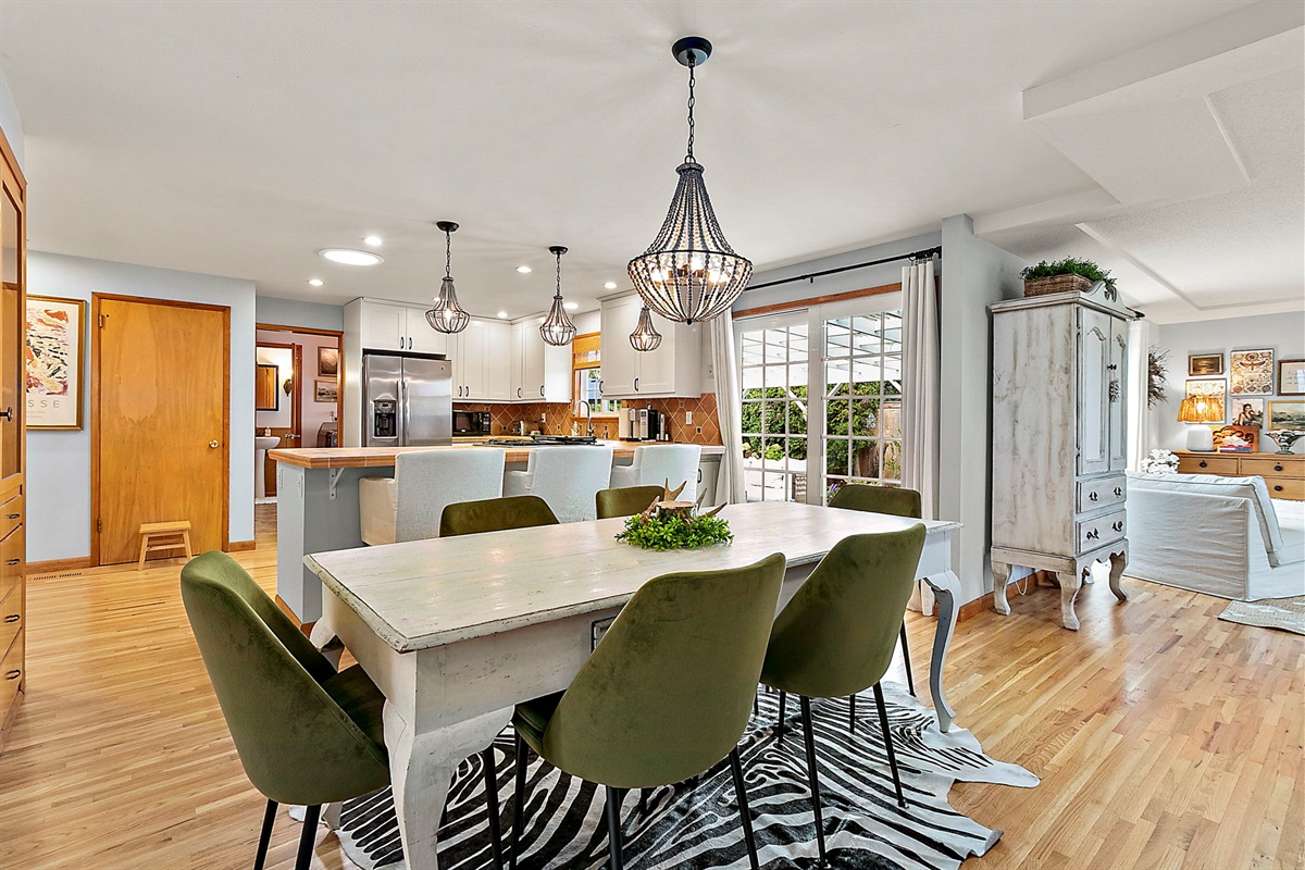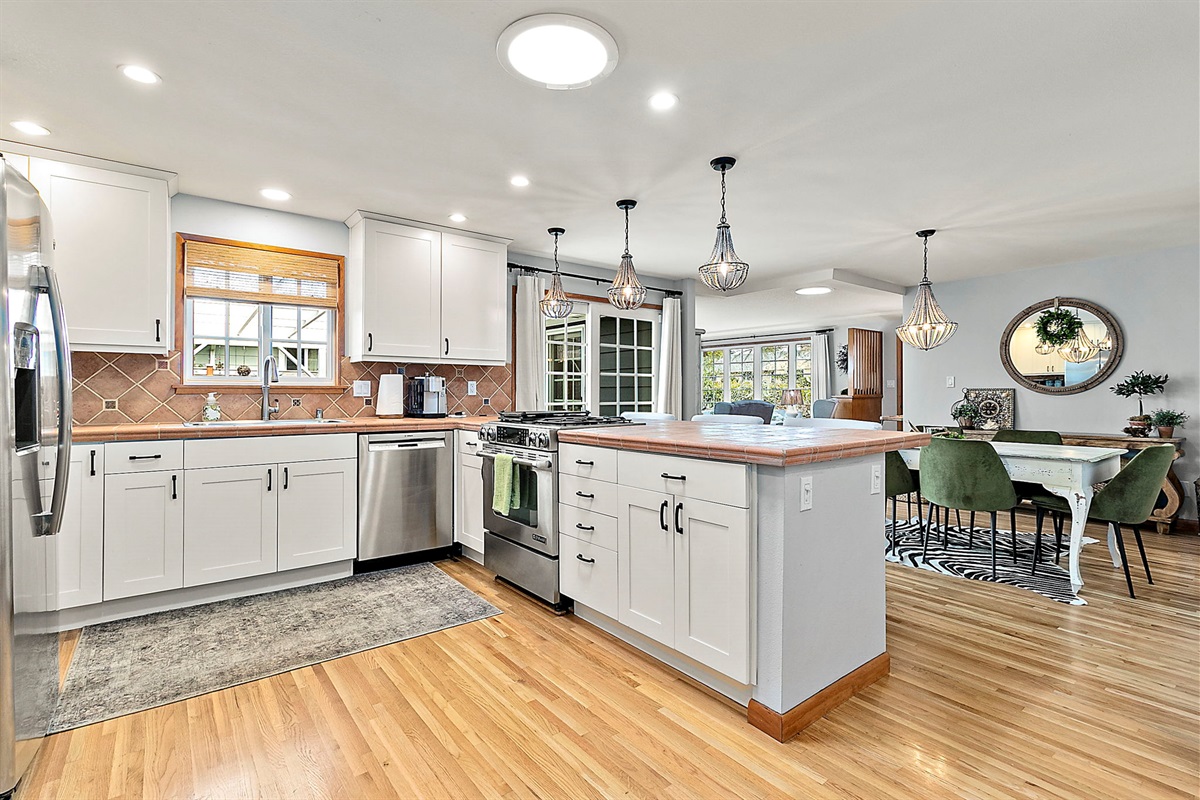 Chef-Ready Kitchen: Whip up home-cooked meals in the fully equipped kitchen, featuring modern essentials and views into the dining area (seating for 5 + 3 tufted barstools at the counter — perfect for entertaining!).
