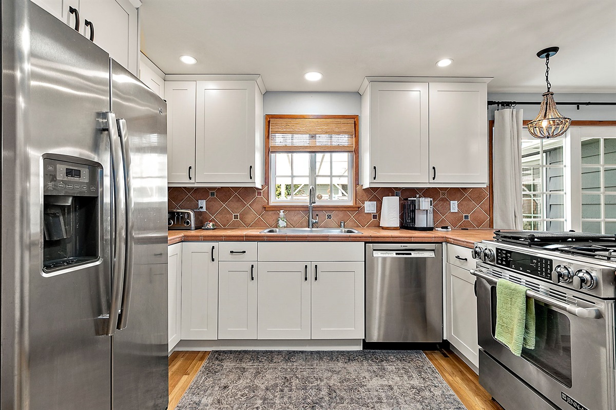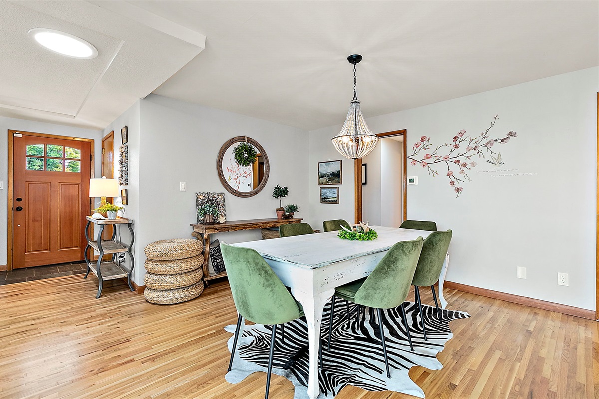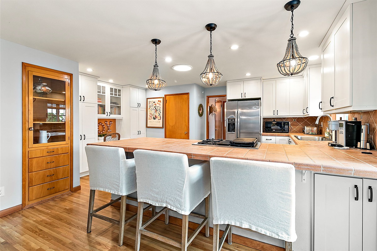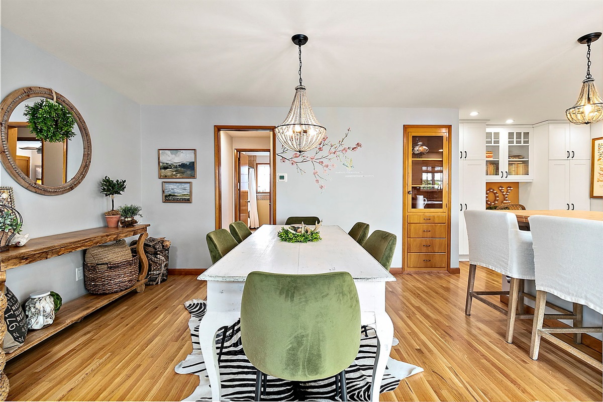 Chef-Ready Kitchen: Whip up home-cooked meals in the fully equipped kitchen, featuring modern essentials and views into the dining area (seating for 5 + 3 tufted barstools at the counter — perfect for entertaining!).