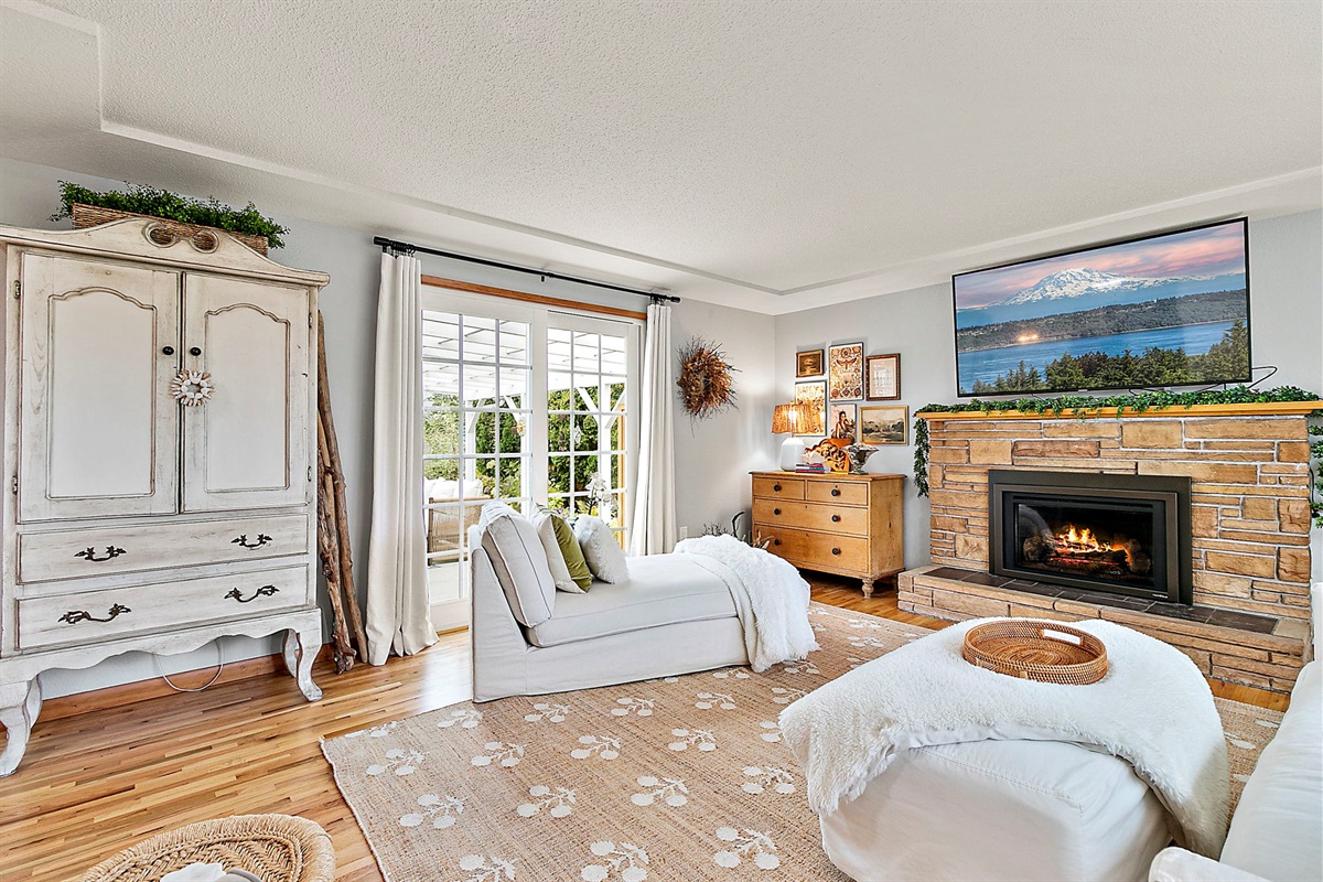 Inviting Living Area: Gather around the cozy gas fireplace on plush down-filled seating, or enjoy your favorite shows on the large Smart TV. A sliding glass door opens to outdoor living for seamless indoor/outdoor flow.